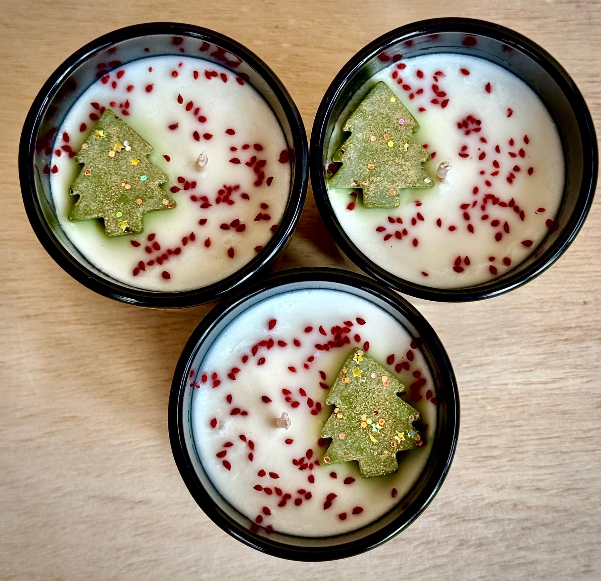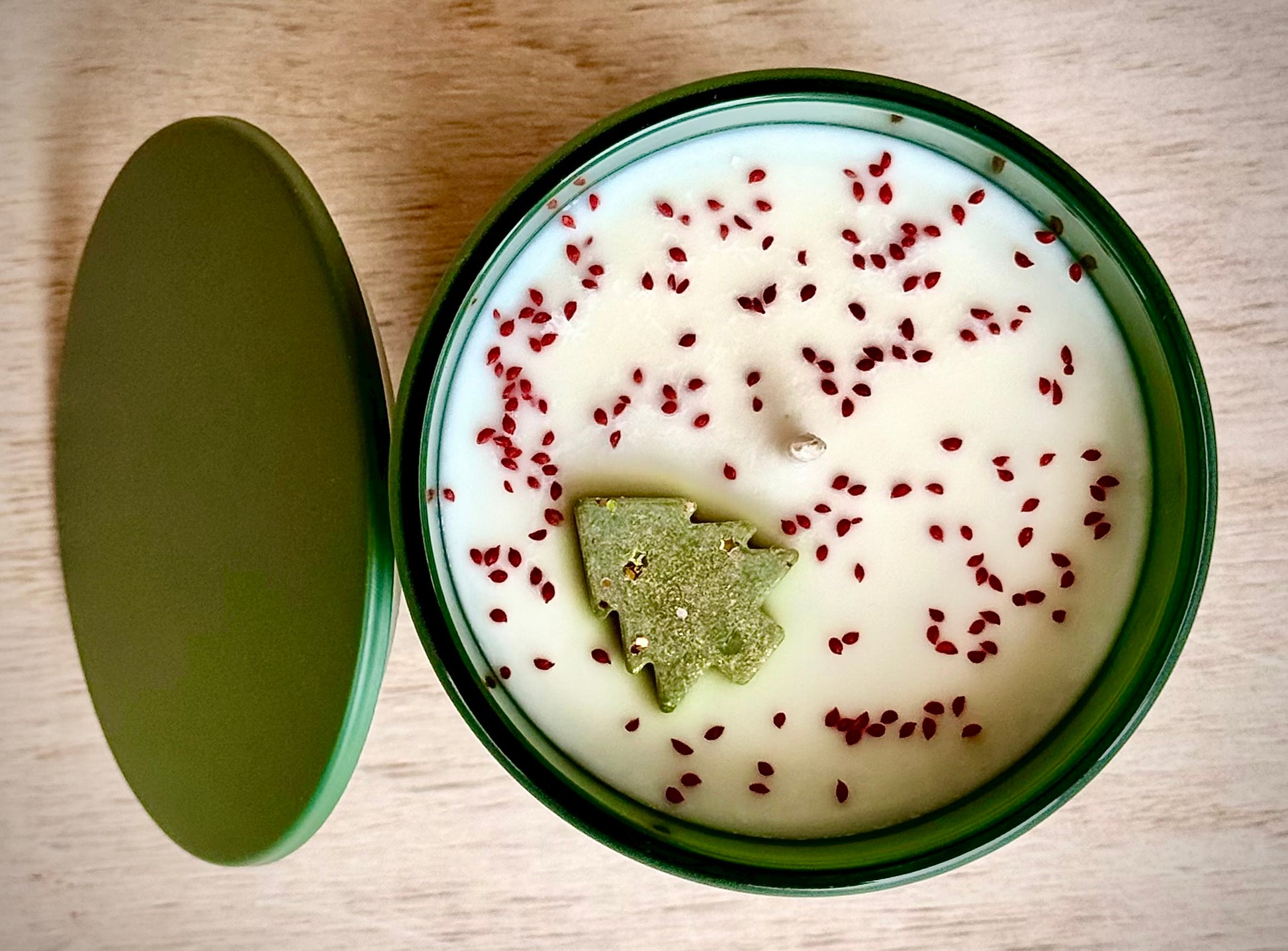 Each candle is topped with a charming Christmas tree wax embed, cranberry seeds, and a touch of festive glitter, adding a seasonal sparkle to this bold, elegant blend.