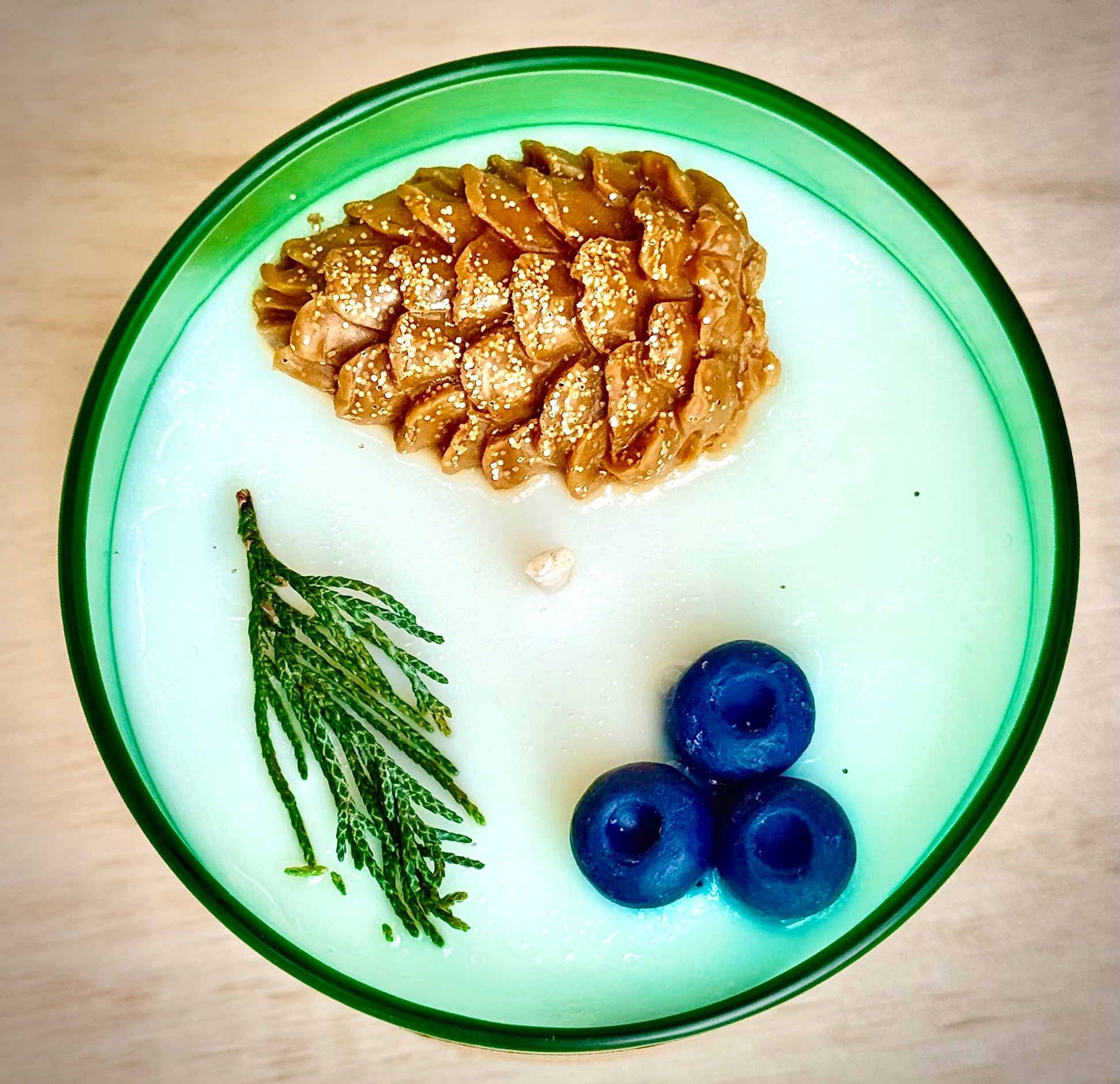 Each candle is topped with charming blueberry and pine wax embeds, a real pine leaf, and a touch of candle-safe glitter, adding a magical, snow-dusted sparkle to every burn.