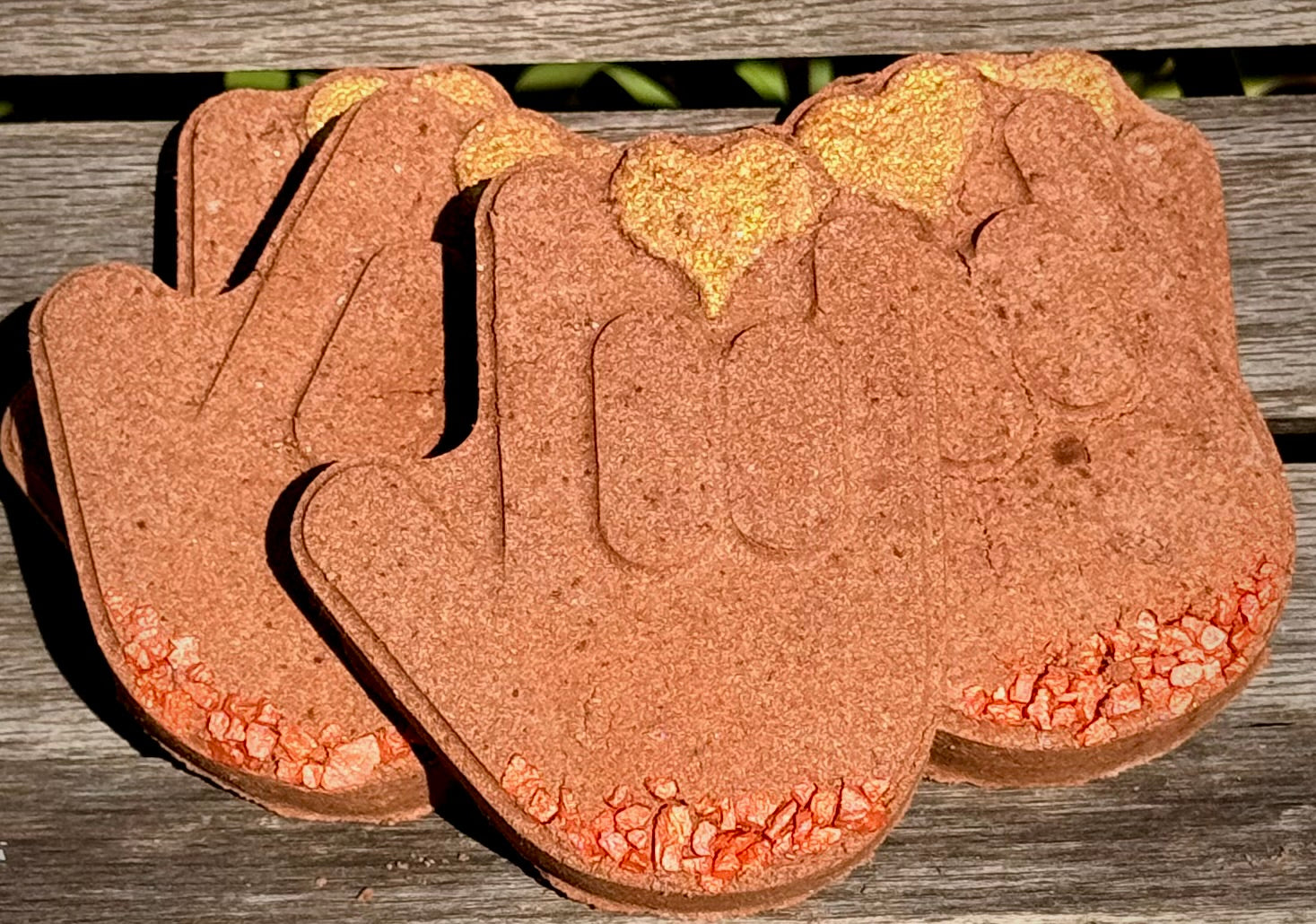 Celebrate love that endures with Everlove — a beautifully hand-crafted bath bomb shaped in the iconic ASL “I Love You” sign. Dipped in earthy brown tones, brushed with a hand-painted gold heart, and finished with a dusting of orange mineral salt, this piece is more than a bath bomb — it’s a symbol of connection, warmth, and care.