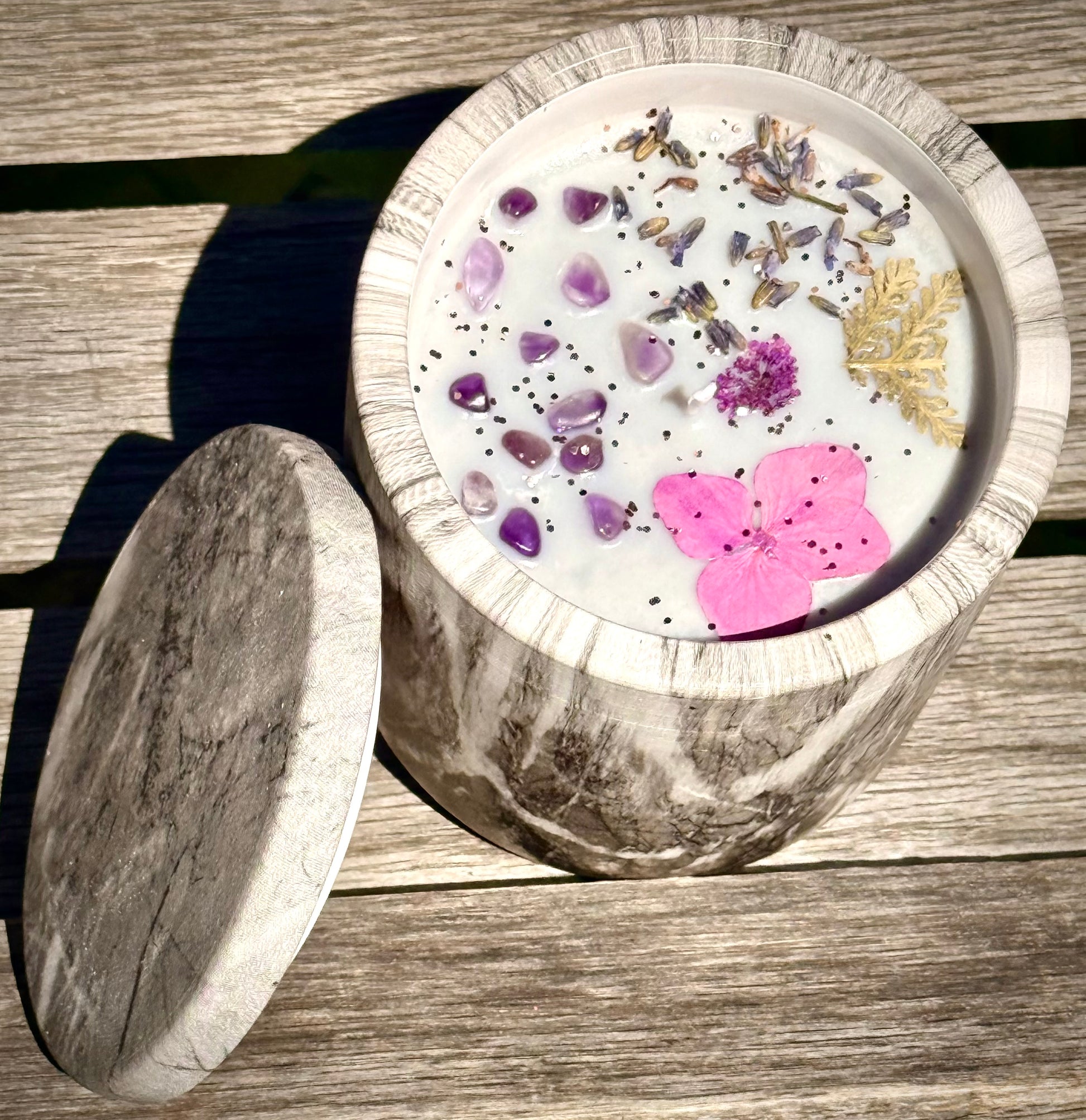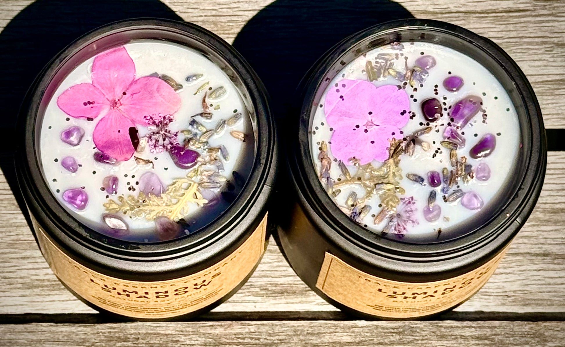 Topped with dried pressed floral petals, lavender buds, and light amethyst stone chips, and lightly sprinkled with candle-friendly glitter, Luminous Shadow captures the delicate balance between illumination and allure—perfect for moments of reflection, ritual, or quiet indulgence.