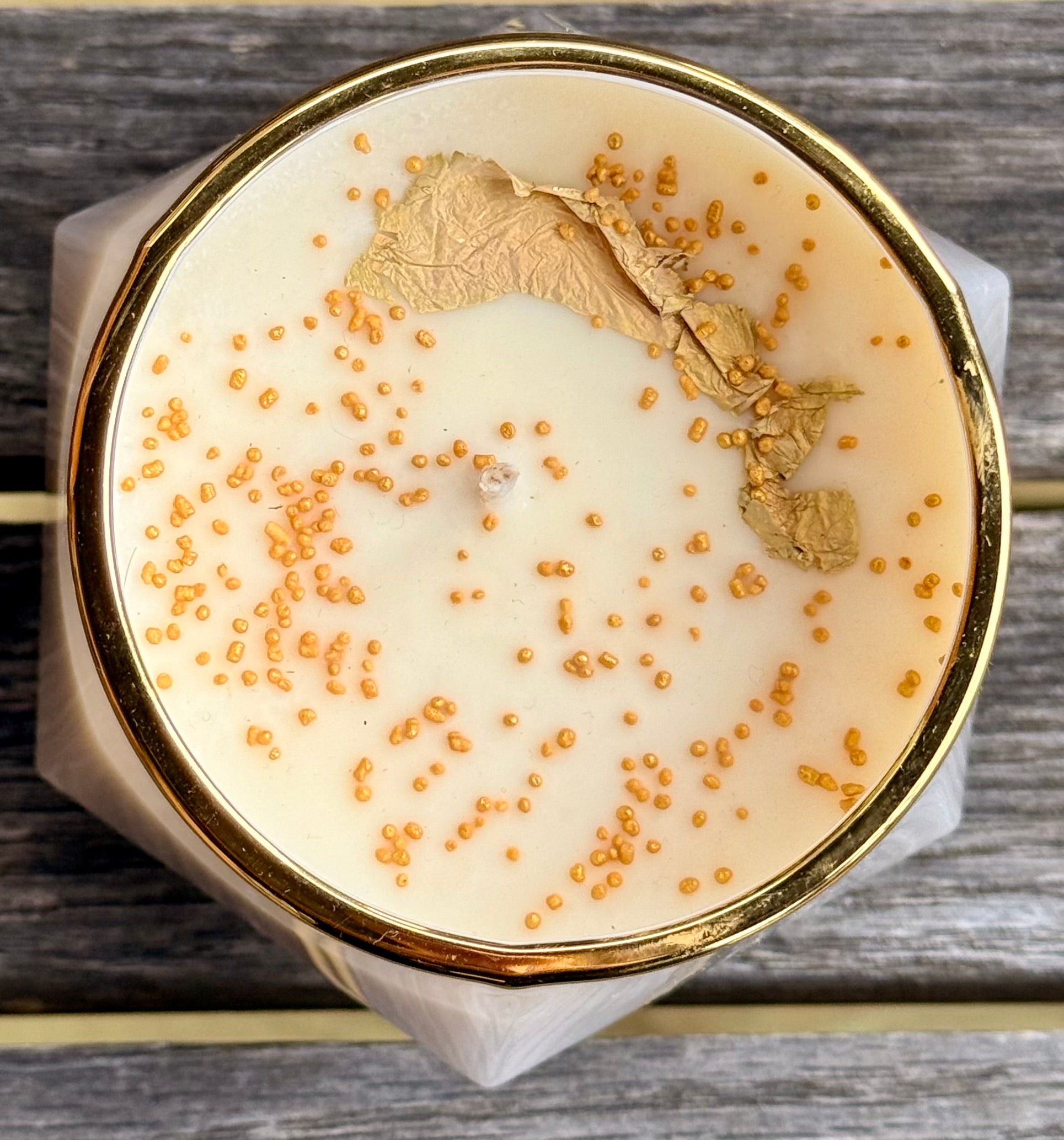 Hand-poured with 100% natural soy wax and finished with gold jojoba bursting beads (releasing nourishing oil as they melt!) plus a touch of gold flakes for a celebratory shimmer.