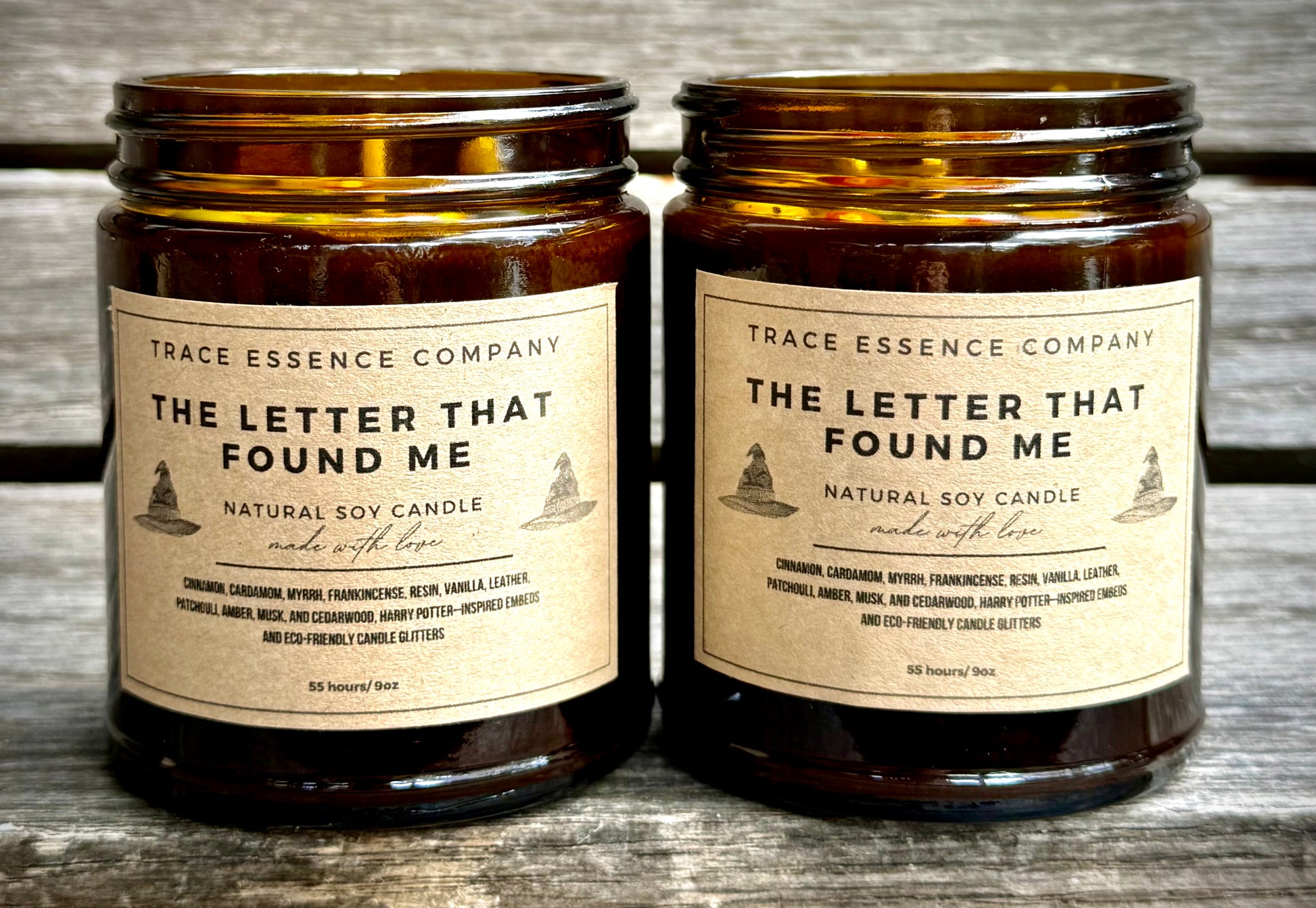 Crafted in a 9oz black glass vessel with 100% natural soy wax, The Letter That Found Me captures the heart of that unforgettable moment: when magic first calls your name. Topped with Harry Potter–inspired embeds, eco-friendly candle glitters, and a charming witch’s hat with floating mail, this candle glows with wonder and nostalgia.