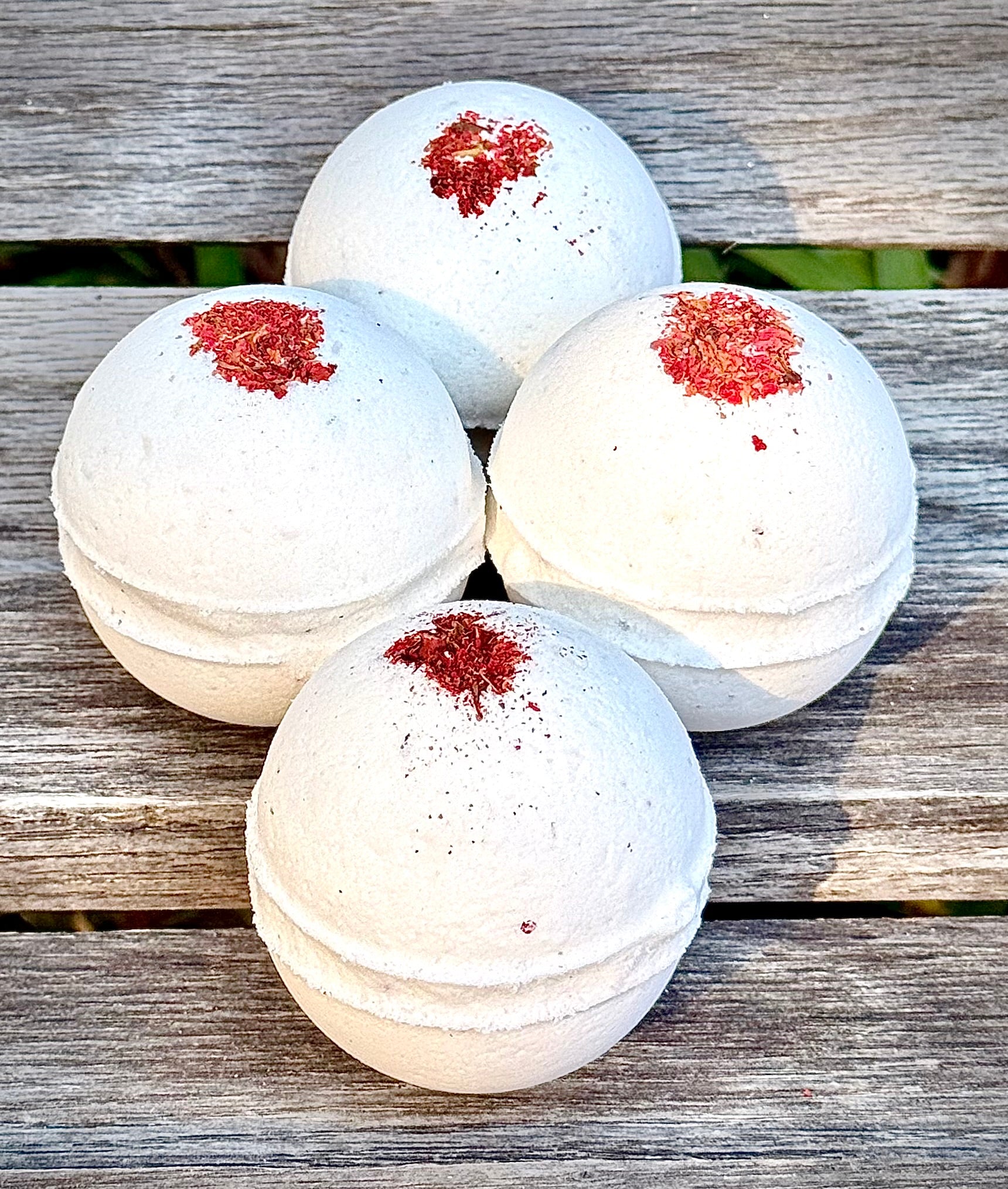 Each rounded white bath bomb is topped with dried pomegranate petals and infused with pomegranate and black currant Epsom salt, rich in antioxidants that help detoxify and rejuvenate the skin while easing muscle tension. The addition of kaolin clay gently draws out impurities, leaving your skin feeling soft, smooth, and refreshed.